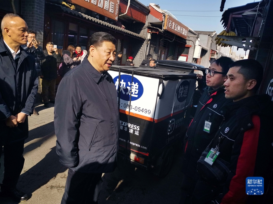 2019年2月1日,习近平在春节前夕来到北京前门石头胡同的快递服务点,看望仍在工作的“快递小哥”。