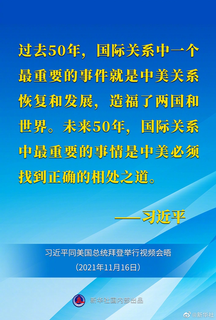 习近平:过去50年,国际关系中一个最重要的事件就是中美关系恢复和发展,造福了两国和世界。未来50年,国际关系中最重要的事情是中美必须找到正确的相处之道。