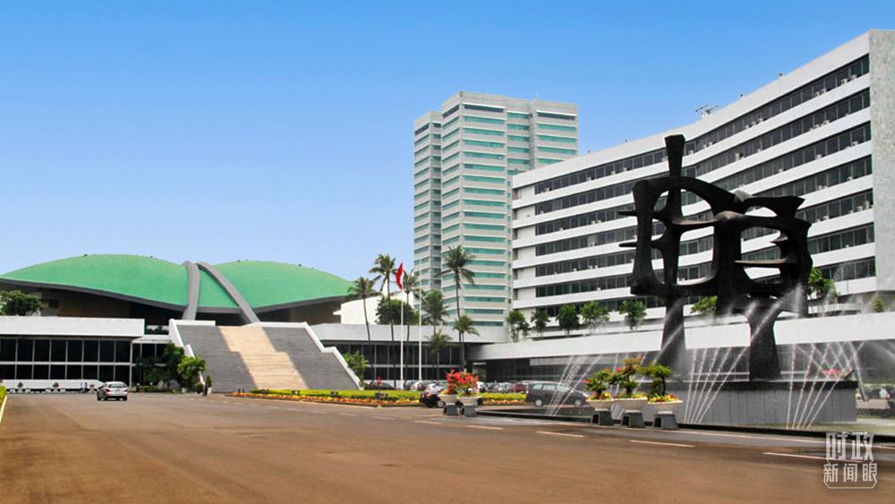 △印度尼西亚国会外景。2013年10月,习主席在这里发表演讲首次提出建设21世纪“海上丝绸之路”。(总台国广记者蔡靖骉拍摄)