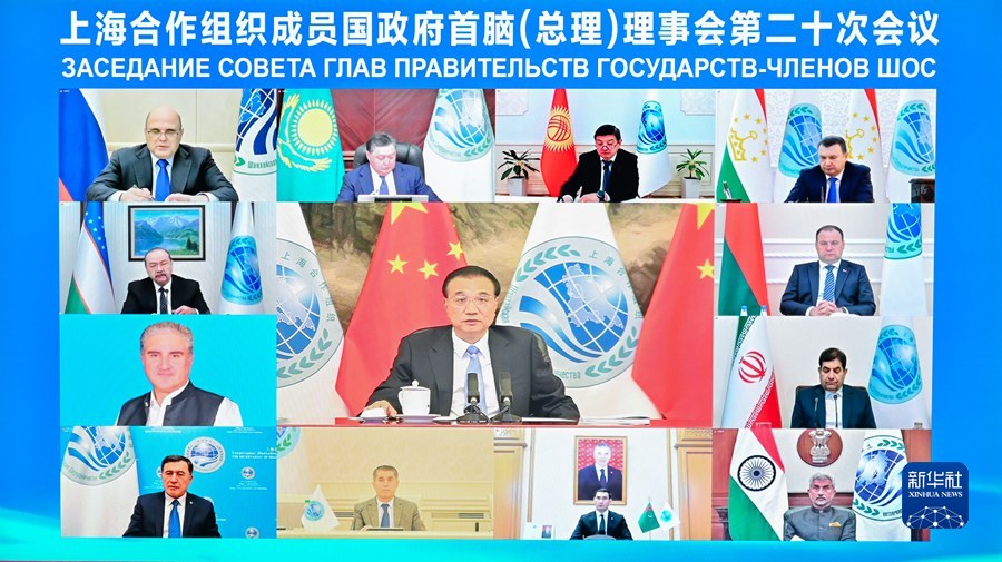 11月25日,国务院总理李克强在北京人民大会堂出席上海合作组织成员国政府首脑(总理)理事会第二十次会议。会议以视频方式举行。新华社记者 翟健岚 摄