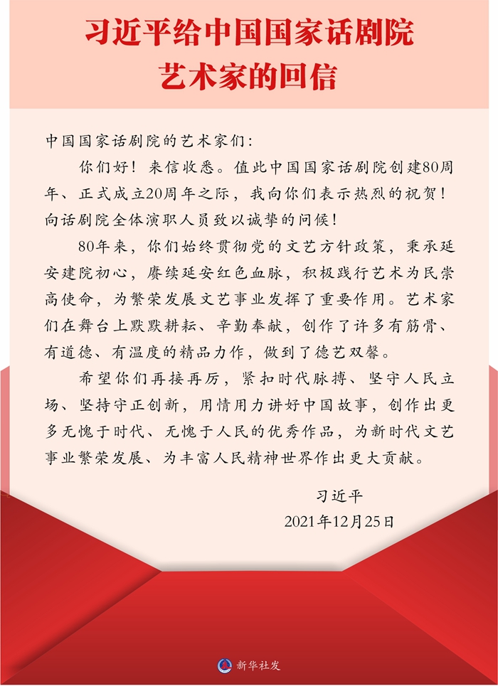 你们好!来信收悉。值此中国国家话剧院创建80周年、正式成立20周年之际,我向你们表示热烈的祝贺!向话剧院全体演职人员致以诚挚的问候!