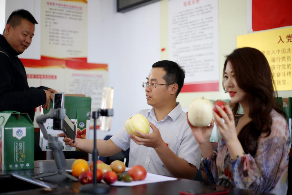 图为内蒙古鄂尔多斯市达拉特旗侯家营子村驻村第一书记张耀雄(右二)正在网上直播推销村里的土特产。(图片为受访对象提供)
