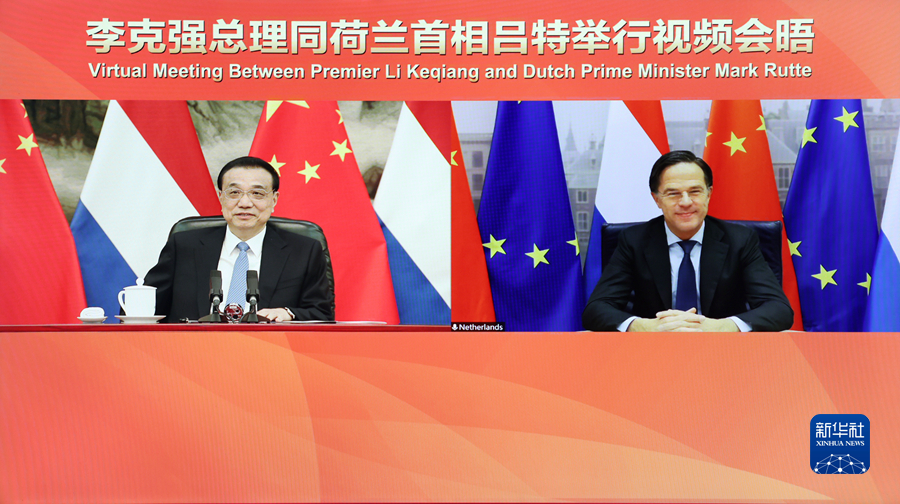 1月26日下午,国务院总理李克强在北京人民大会堂同荷兰首相吕特举行视频会晤。新华社记者 刘彬 摄