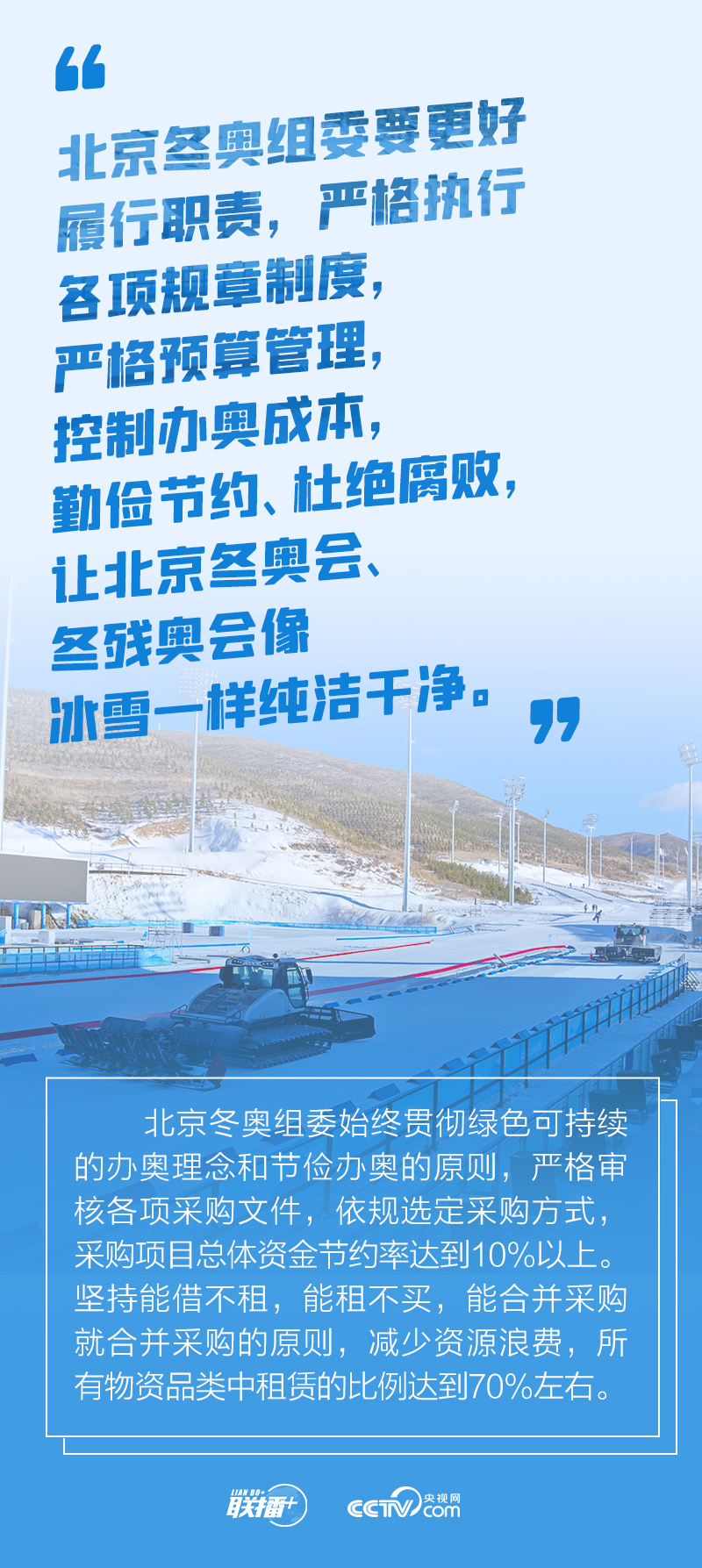 冬奥会筹办过程中,总书记始终严格要求把勤俭节约作为“廉洁办奥”的重要内容。2021年1月20日召开的会议进一步提出要做好简化办赛工作,从实际出发,精简非必要环节、活动和人员数量。