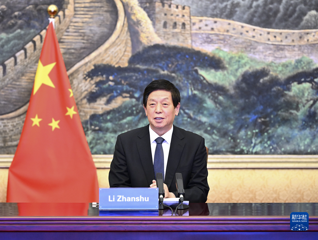 2月22日,全国人大常委会委员长栗战书在北京人民大会堂以视频方式同阿尔及利亚国民议会议长布加利举行会谈。新华社记者 燕雁 摄