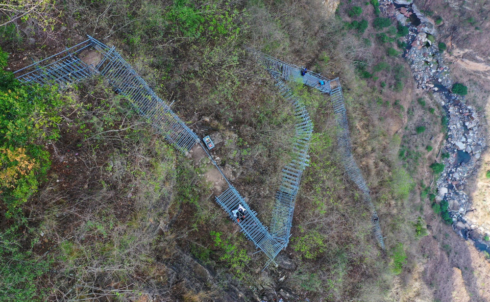 ↑在四川省凉山彝族自治州昭觉县阿土列尔村的悬崖钢梯上,村民沿着钢梯下山(2020年5月13日摄,无人机照片)。