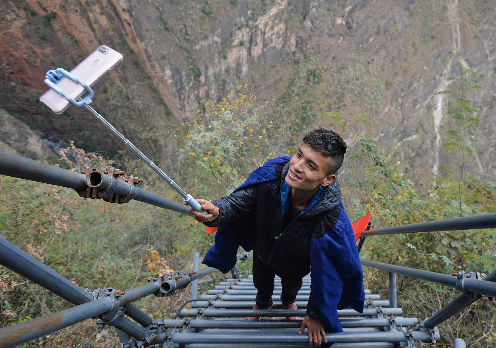 ↑某色苏不惹在通往“悬崖村”的钢梯上直播(2017年12月15日摄)。