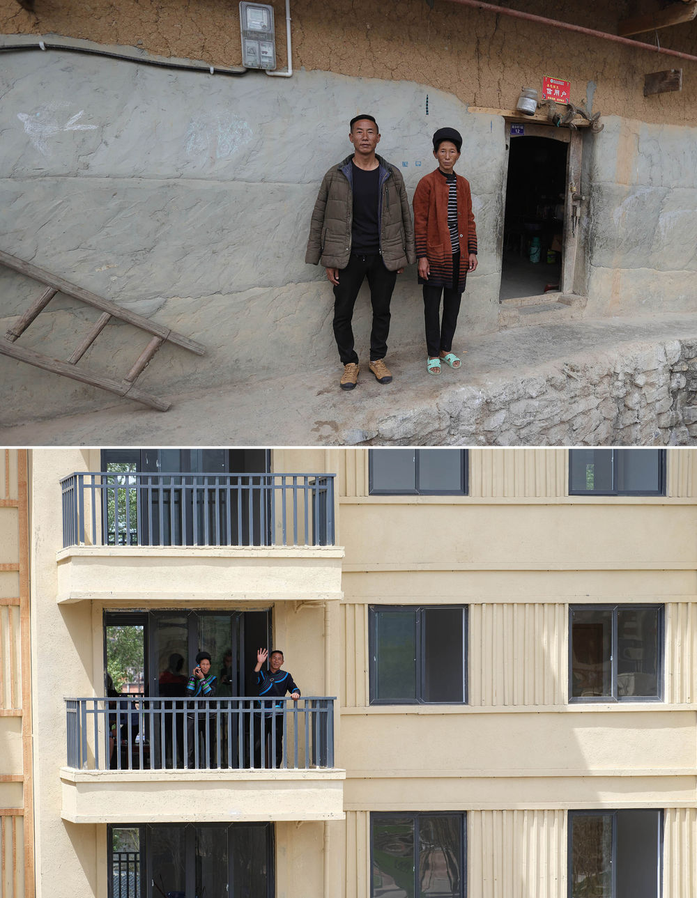 ↑拼版照片:上图为四川省昭觉县阿土列尔村村民某色达体夫妇在“悬崖村”的家门口拍照留念(2020年5月13日摄);下图为某色达体夫妇在昭觉县城易地扶贫搬迁安置点南坪社区新家的阳台上挥手(2020年5月13日摄)。