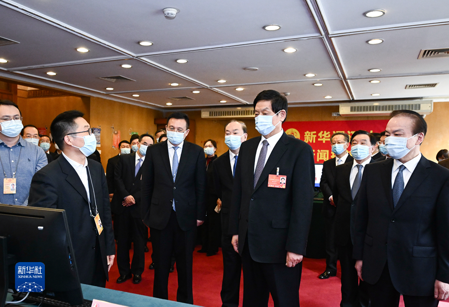 下午三时许,在人民大会堂一楼大厅,栗战书看望了人民日报、新华社、中央广播电视总台、光明日报、经济日报、中国日报、中国新闻社、法治日报等新闻媒体负责同志和新闻工作者,听取大会新闻报道情况介绍。他来到设在一楼大厅的新华社两会新闻报道中心,观看新华网专题页面、《新华每日电讯》等大会专版专刊内容,了解新华社大会报道融媒体产品和多语种报道的全球传播等情况。
