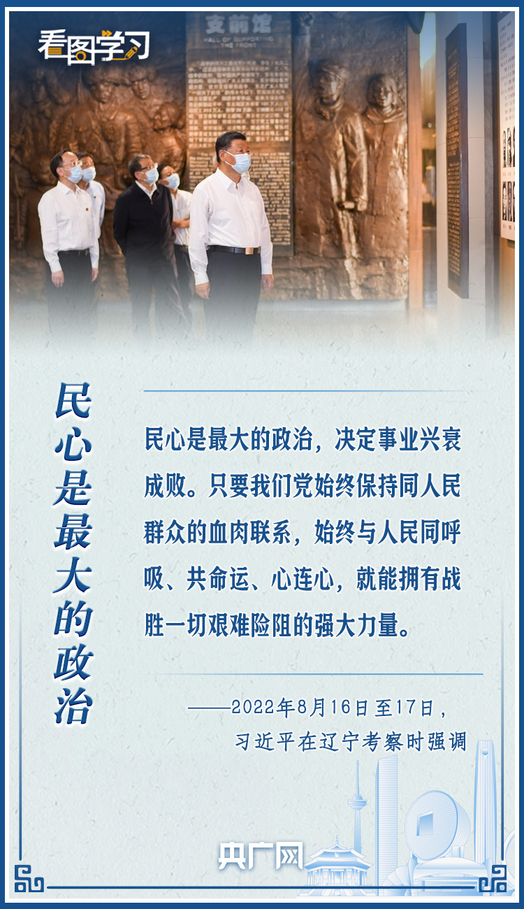 8月16日至17日,习近平总书记来到辽宁锦州、沈阳,深入革命纪念馆、河湖治理工程、企业、社区等进行调研。每到一个地方,总书记总会提到“人民”二字。他强调,要让老百姓体会到我们党是全心全意为人民服务的,党始终在人民群众身边。一起来学习!