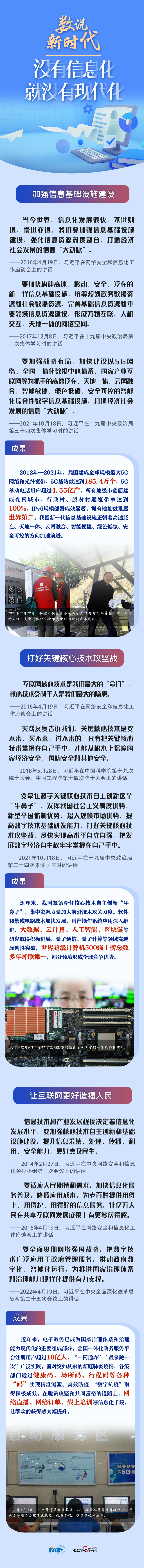 党的十八大以来,习近平总书记高度重视信息化对经济社会发展的驱动引领作用,多次强调要加强信息基础设施建设,打好关键核心技术攻坚战,让互联网更好造福人民。