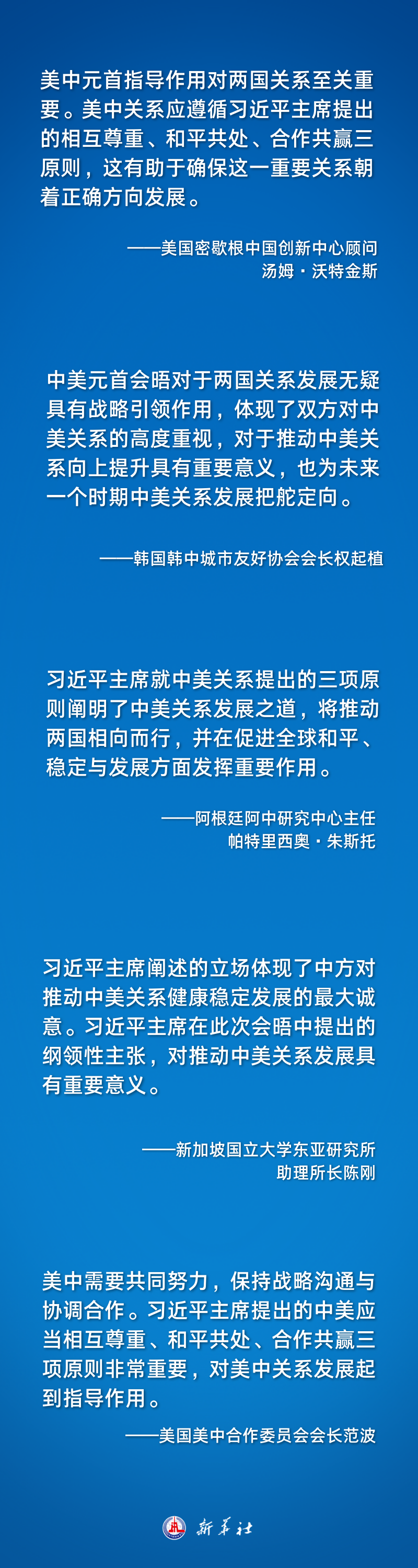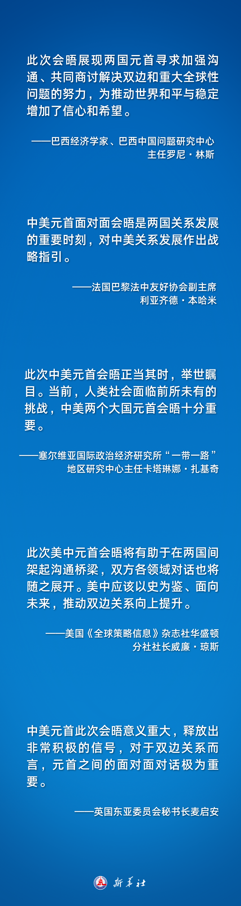 此次会晤引起国际社会高度关注。多国人士接受新华社记者采访时表示,元首外交为中美关系发展把舵定向至关重要。当前,世界正处于一个重大历史转折点,人类社会面对前所未有的挑战,推动中美关系重回健康稳定发展轨道,将造福两国,惠及世界。