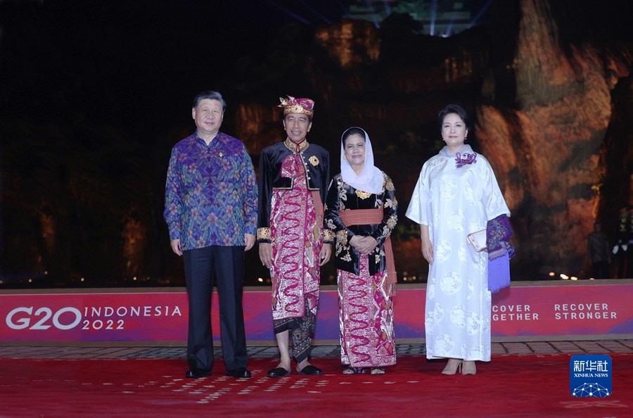 当地时间11月15日晚,国家主席习近平和夫人彭丽媛在印度尼西亚巴厘岛出席二十国集团领导人峰会欢迎晚宴。这是习近平主席夫妇在晚宴前同印度尼西亚总统佐科夫妇合影。新华社记者 鞠鹏 摄