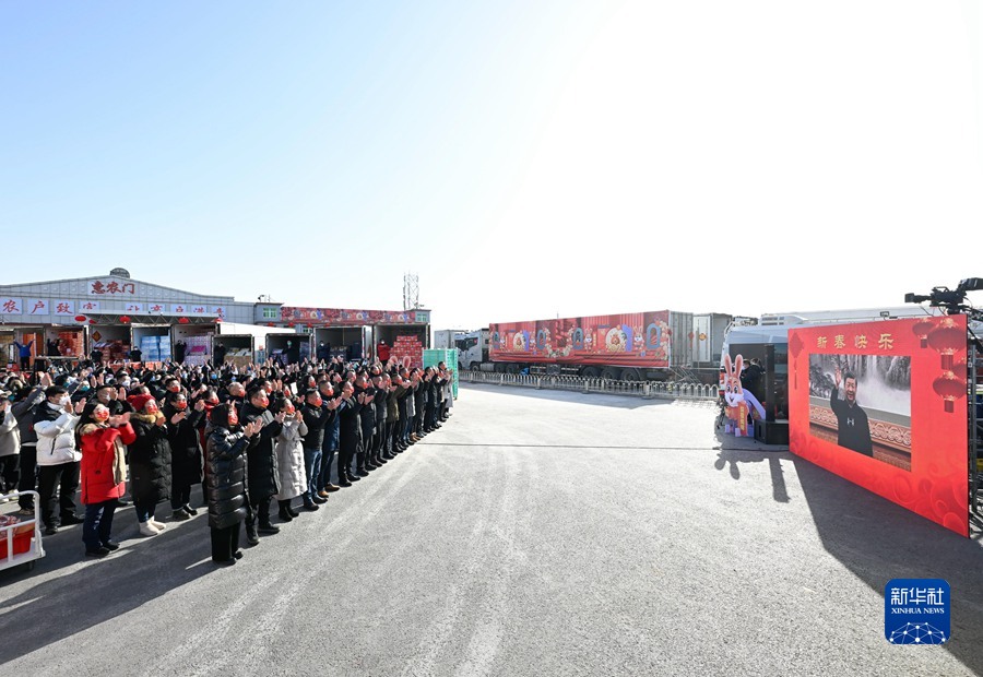 1月18日,中共中央总书记、国家主席、中央军委主席习近平在北京通过视频连线看望慰问基层干部群众,向全国各族人民致以新春的美好祝福。这是习近平通过视频连线,同北京新发地农产品批发市场的商户和采购年货的群众亲切交流。新华社记者 申宏 摄