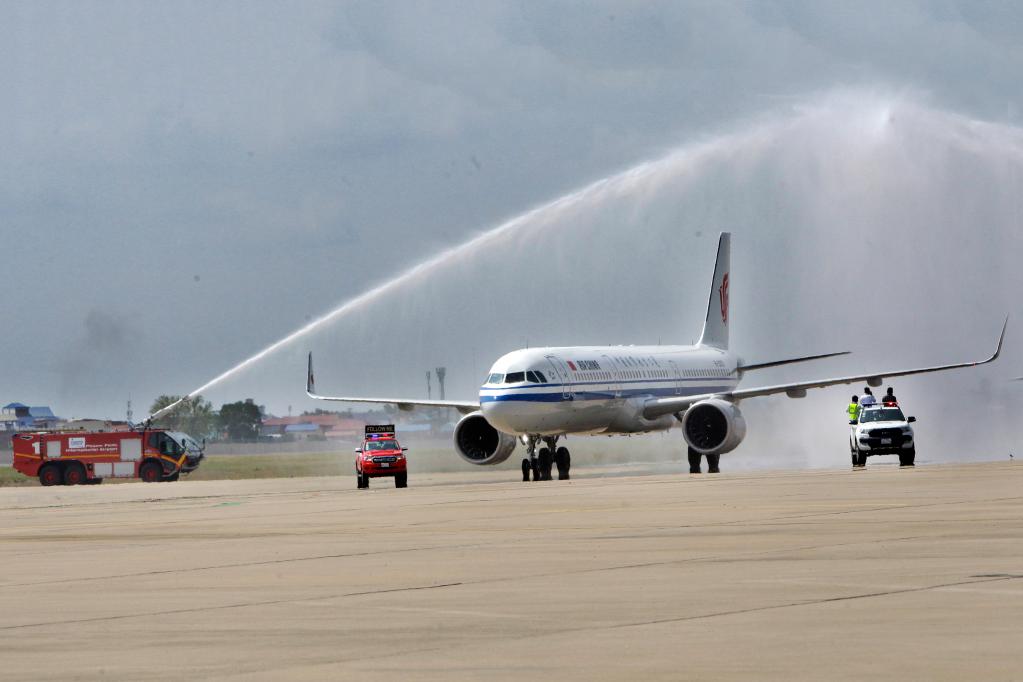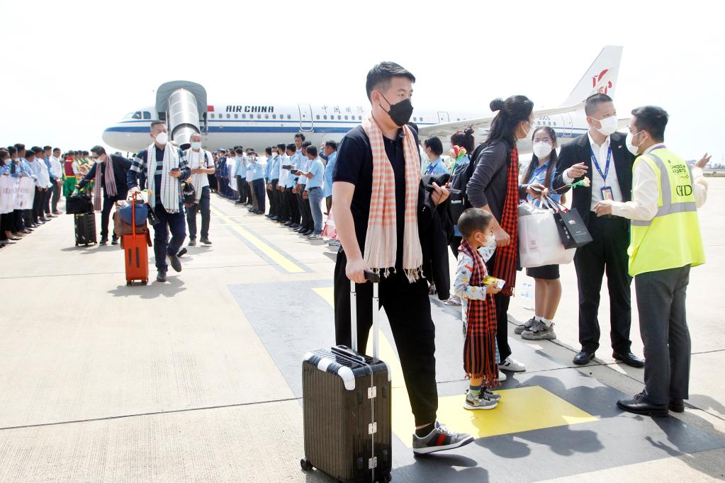 2月7日,一架载有中国乘客的国航航班从北京出发抵达柬埔寨首都金边国际机场,受到柬方热烈欢迎。