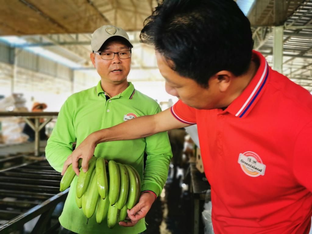 2020年7月16日,在柬埔寨桔井省的柬埔寨—中国热带生态农业合作示范区内,绿洲农业发展(柬埔寨)有限公司总经理高冠华(右)和公司香蕉产业技术副总监吴诚检查香蕉的品质。