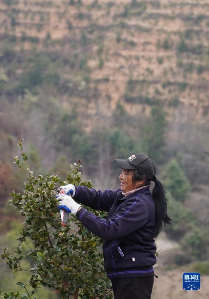 2月24日,在位于江西赣州市经开区湖边镇蛤湖村的白石下油茶基地,农户在修剪植株。新华社记者 周密 摄