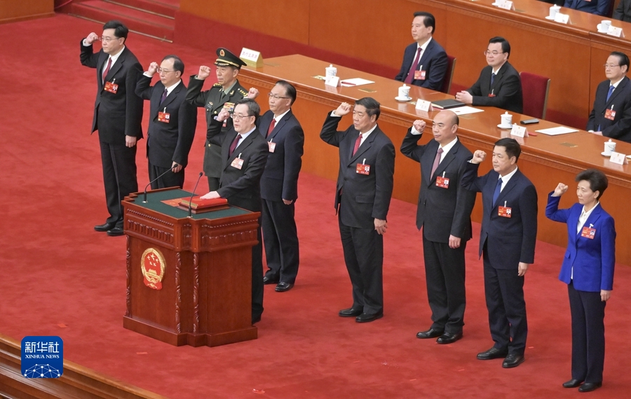3月12日,十四届全国人大一次会议在北京人民大会堂举行第五次全体会议。根据国务院总理李强的提名,经投票表决,决定丁薛祥、何立峰、张国清、刘国中为国务院副总理,李尚福、王小洪、吴政隆、谌贻琴、秦刚为国务委员,吴政隆为国务院秘书长。这是国务院副总理、国务委员、秘书长进行宪法宣誓。