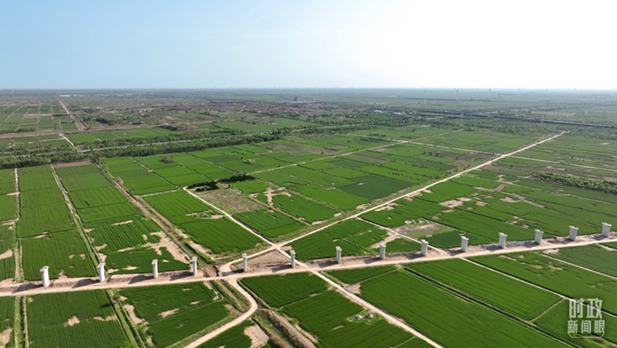 △旱碱麦田被分割成整齐划一的绿色方块。(总台记者郭永良拍摄)