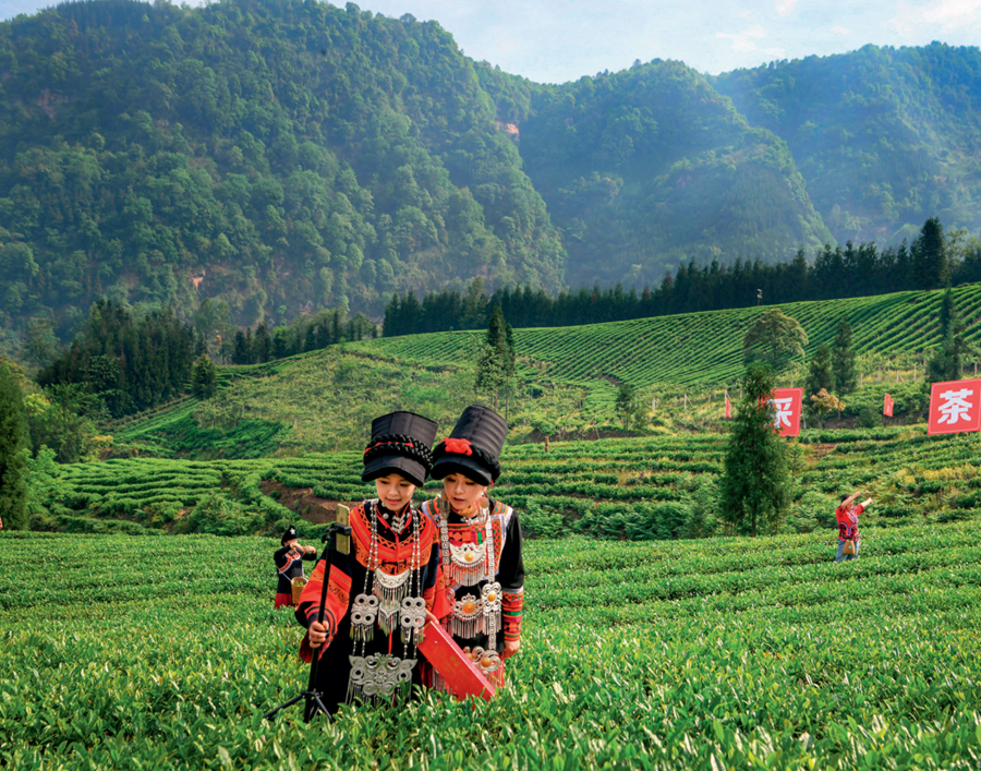 图片四川省小凉山地区的乐山市马边彝族自治县福来村,身着传统彝族服饰的工作人员用手机直播采茶(2022年4月27日摄) 唐文豪摄 / 本刊