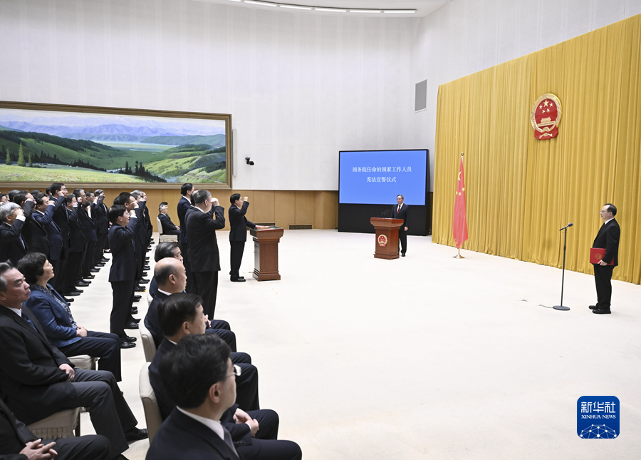 宣誓后,国务院总理李强作了讲话。他说,庄严的仪式总是让我们内心受到深深的触动,精神得到洗礼和升华,希望大家把铮铮誓言内化于心、外化于行,体现到日常工作和生活的方方面面,用奋斗来坚守誓言、践行承诺。他强调,要永葆忠诚之心,最根本的是要淬炼对党的忠诚之心,坚持用习近平新时代中国特色社会主义思想凝心铸魂,深刻领悟“两个确立”的决定性意义,自觉做到“两个维护”,无论面对什么样的形势,经历什么样的风浪,都要在思想上政治上行动上同以习近平同志为核心的党中央保持高度一致,忠于宪法,忠于祖国,忠于人民。要强化进取之心,坚持以人民为中心的发展思想,不断提振干事创业的精气神,尽心竭力地为党和人民做事,集中精力推动高质量发展,全面深化改革开放,以新作为推动各项事业发展取得新突破,努力在大变局中赢得主动、赢得优势。要常怀敬畏之心,牢固树立正确的权力观、政绩观、事业观,恪守法治精神、维护宪法权威、严格依法行政,铸牢思想防线、守住廉洁底线、守牢法纪红线,始终保持共产党人的政治本色,清清白白做人,干干净净做事。他强调,使命责任在肩,笃行方能致远,要把誓言体现在行动上、落实到实践中,在以习近平同志为核心的党中央坚强领导下,坚决做贯彻党中央决策部署的执行者、行动派、实干家,为全面建设社会主义现代化国家、实现中华民族伟大复兴中国梦不懈奋斗。
