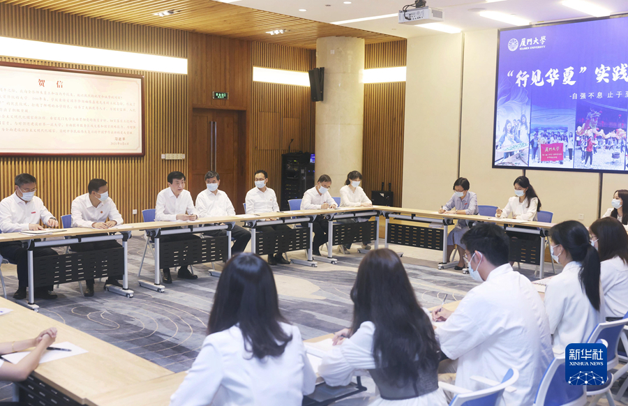 6月17日,第十五届海峡论坛大会在福建厦门举行。中共中央政治局常委、全国政协主席王沪宁出席,宣读习近平总书记贺信并致辞。在闽期间,王沪宁参观福州市“3820”战略工程实施30周年成就展、“共同家园 共同记忆——闽台关系档案文献展”,看望在福州的全国政协委员和福建省政协机关干部、厦门大学在校台湾学生,考察台资企业、福州市三坊七巷历史文化街区、厦门市海沧区洪塘村赤土社、厦门五通客运码头等。这是王沪宁看望厦门大学在校台湾学生。