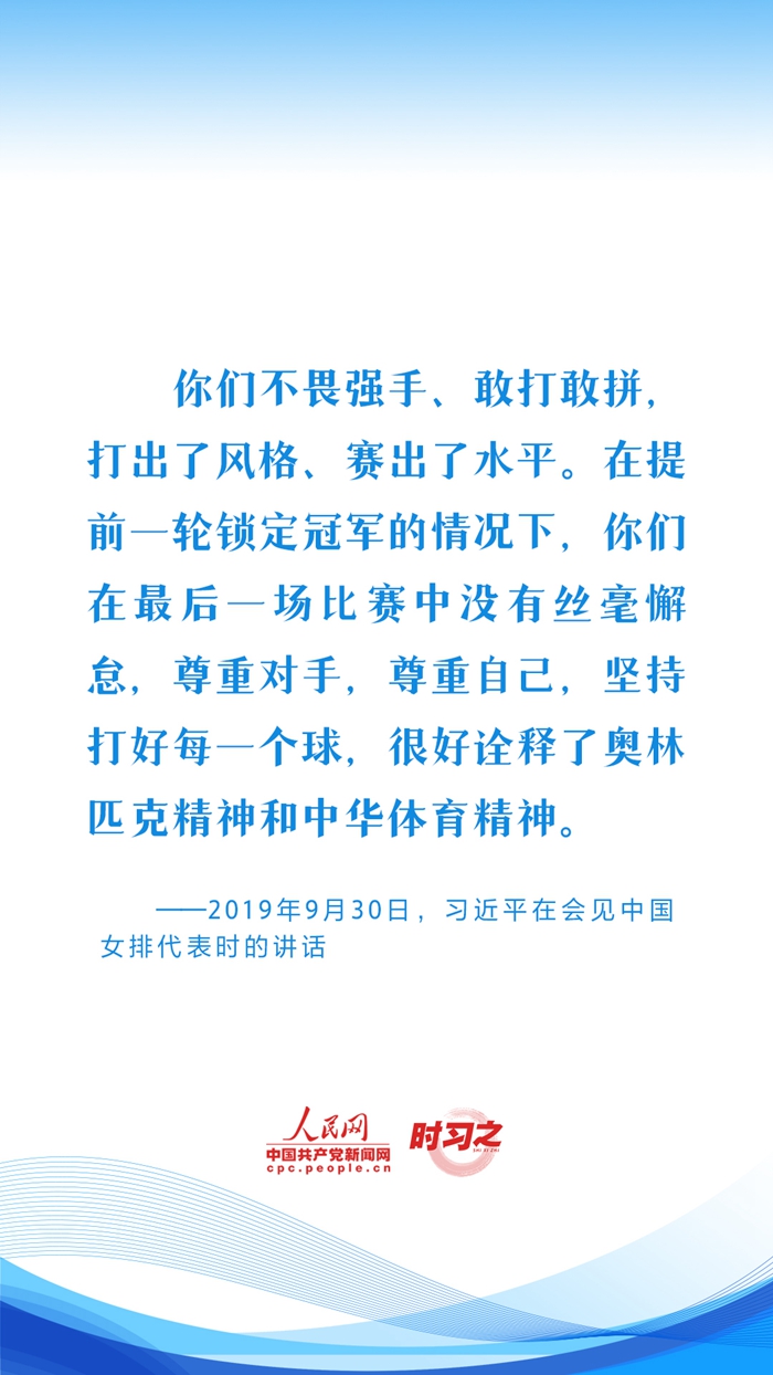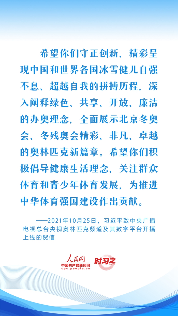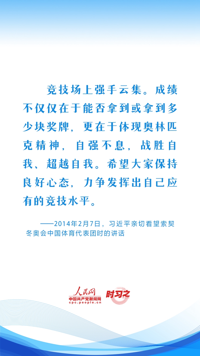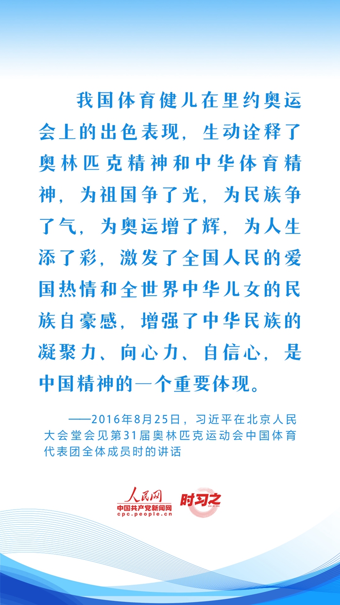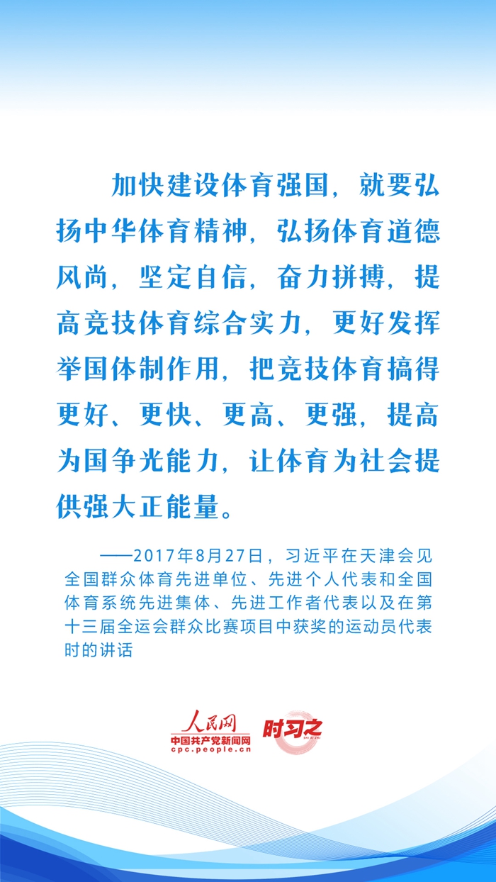 习近平始终心系体育事业发展,句句铿锵话语激励着广大体育工作者继续弘扬奥林匹克精神和中华体育精神,推动我国体育强国建设。