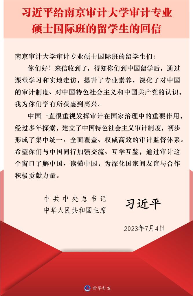 习近平给南京审计大学审计专业硕士国际班的留学生的回信