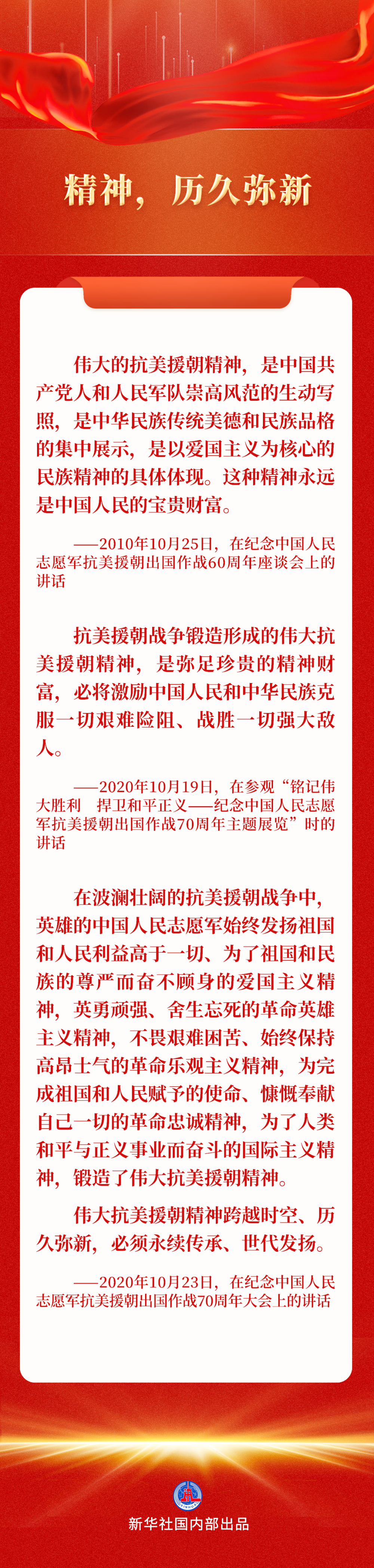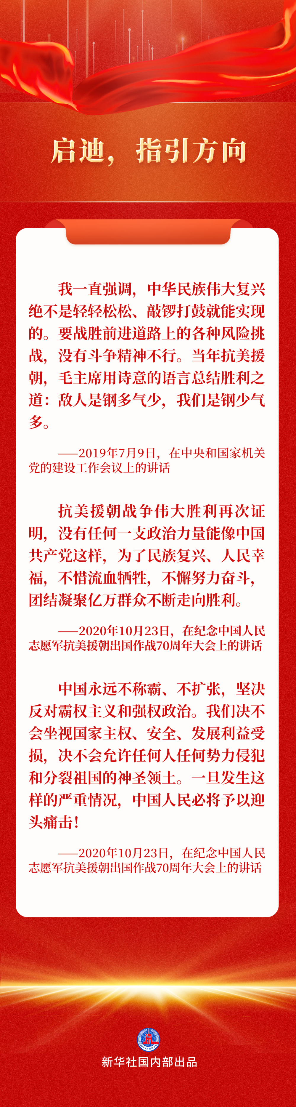 习近平总书记曾多次谈起这段气壮山河的英雄史诗,深情讲述这些“最可爱的人”的动人故事,以史为鉴,为全党全军全国各族人民指明前行方向。