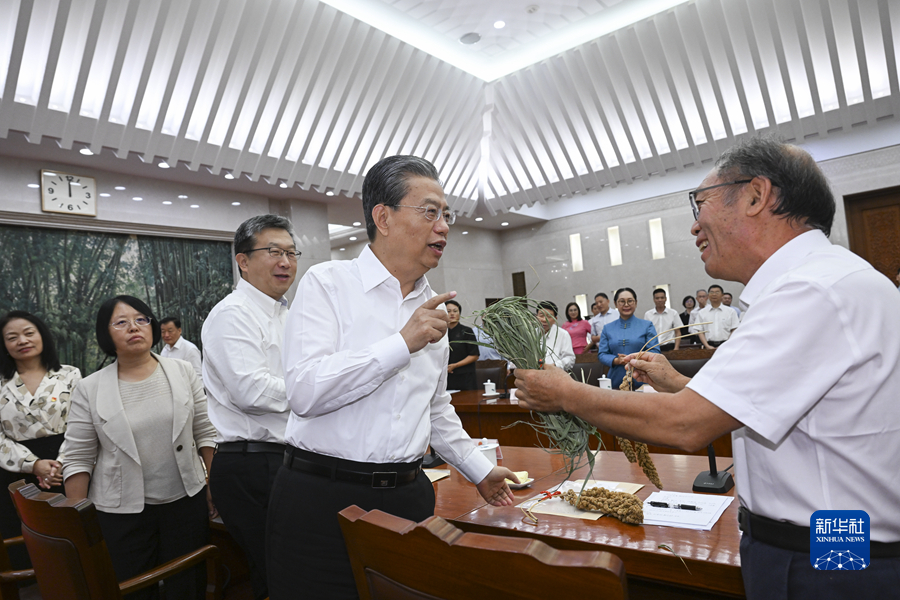 8月31日,中共中央政治局常委、全国人大常委会委员长赵乐际在北京同列席十四届全国人大常委会第五次会议的全国人大代表,结合审议国务院关于确保粮食安全工作情况的报告,进行座谈交流。这是座谈会结束时,赵乐际与来自河北省张家口市农科院的农业科技专家赵治海就农业种植结构调整和农业科技推广应用进行交流。
