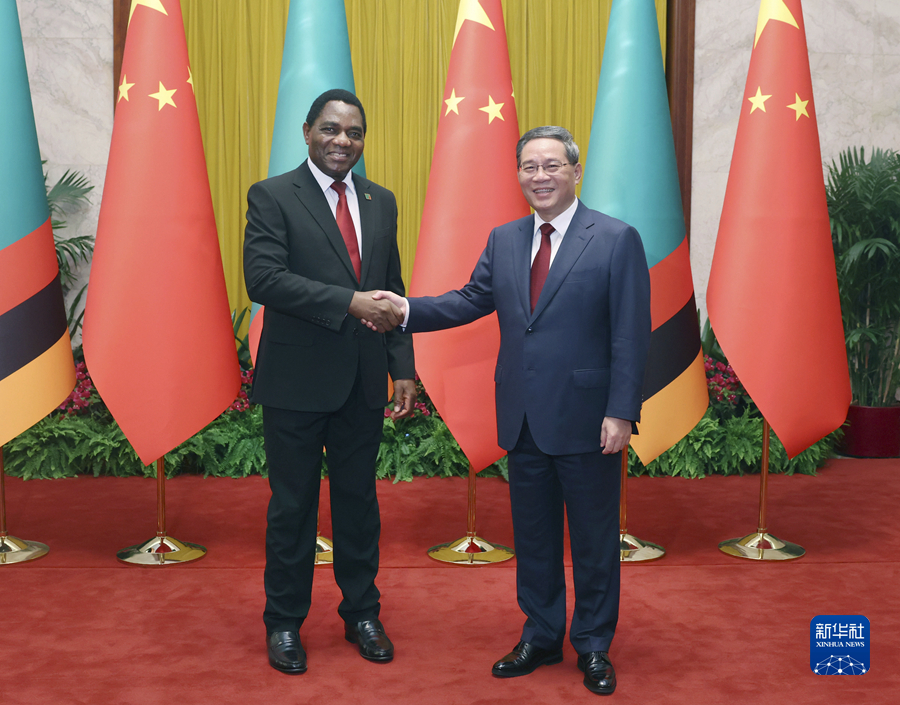 9月15日下午,国务院总理李强在北京人民大会堂会见来华进行国事访问的赞比亚总统希奇莱马。新华社记者 刘卫兵 摄