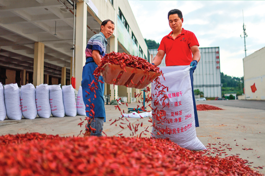 在贵州省遵义市中国辣椒城,工人将辣椒装袋(2023年6月6日摄)刘续摄 / 本刊