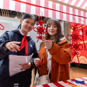 在复旦大学第二附属学校,校民乐团为远道而来的朋友准备了《步步高》等中国传统乐曲演奏表演。两国学生还分为四组,围成圆圈席地而坐做游戏,根据手中卡片的提示分享彼此的兴趣爱好。两国学生你一言、我一语,在交流互动中增进友谊。游戏过后,学生们还体验了剪纸、编中国结、包春卷等传统习俗。
