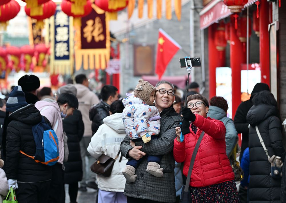 1月28日,游客在天津古文化街合影留念。