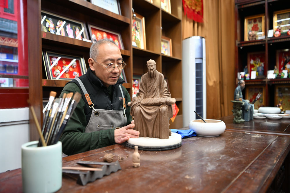 2月1日,在天津古文化街,泥人张制作部的老师傅刘强在店内工作。