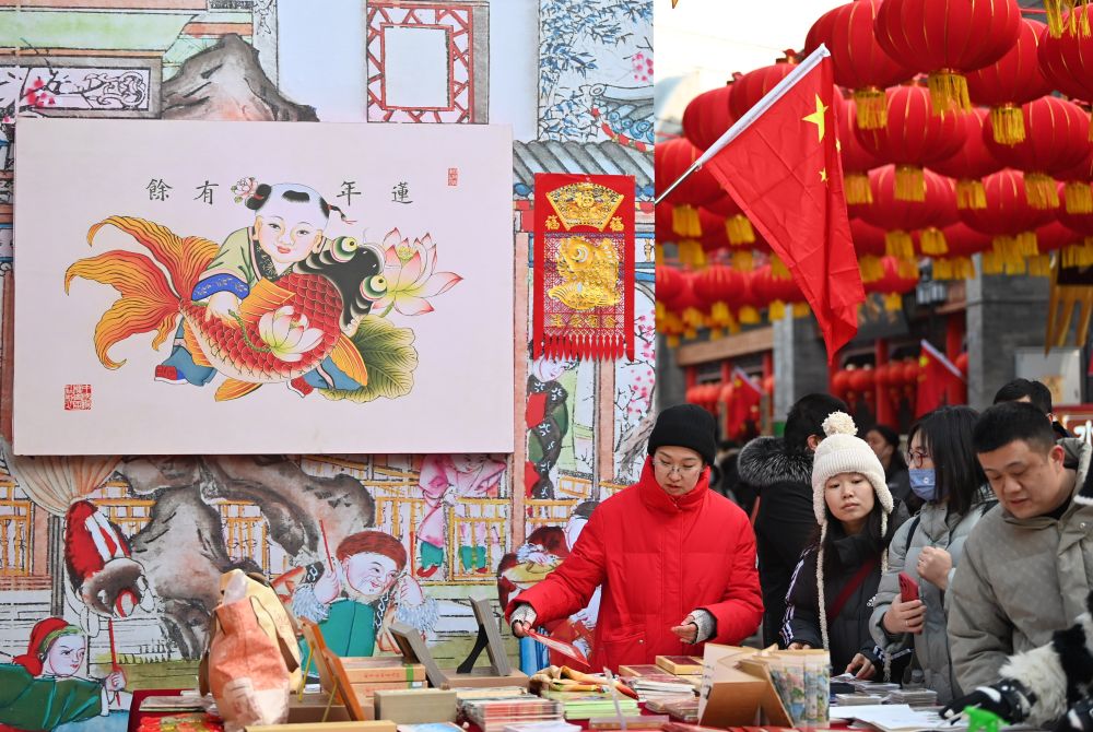 2月1日,在天津古文化街,游客在选购天津杨柳青画社的年画。