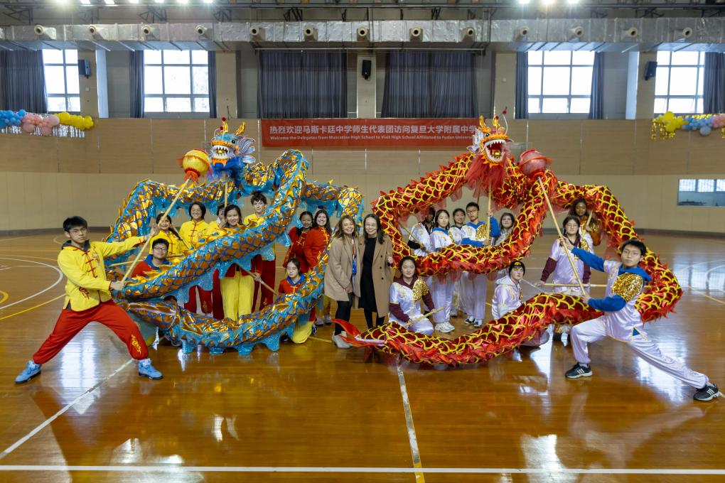 1月29日,在复旦大学附属中学,美国马斯卡廷中学学生参加舞龙体验活动。