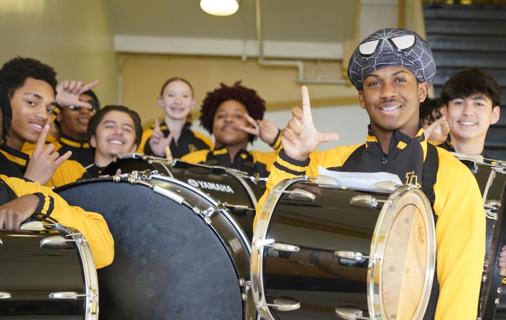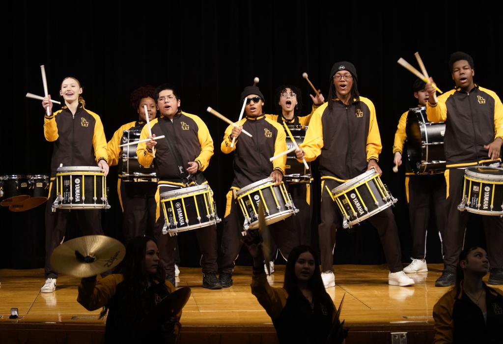 1月30日,在美国华盛顿州塔科马市林肯中学,学校鼓乐队在美国中学生赴华交流欢送仪式上表演。