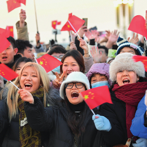 北京天安门广场举行隆重的升国旗仪式。图为观众在升旗仪式结束后欢呼(2024年1月1日摄)陈钟昊摄/本刊