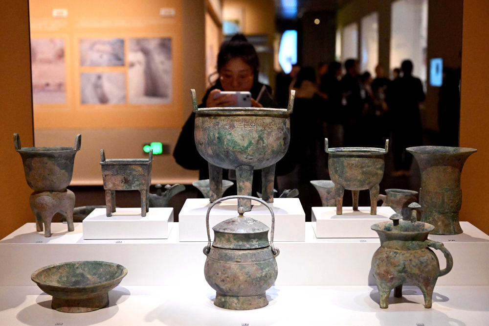 2月26日,参观者在河南安阳殷墟博物馆新馆内拍摄展品。