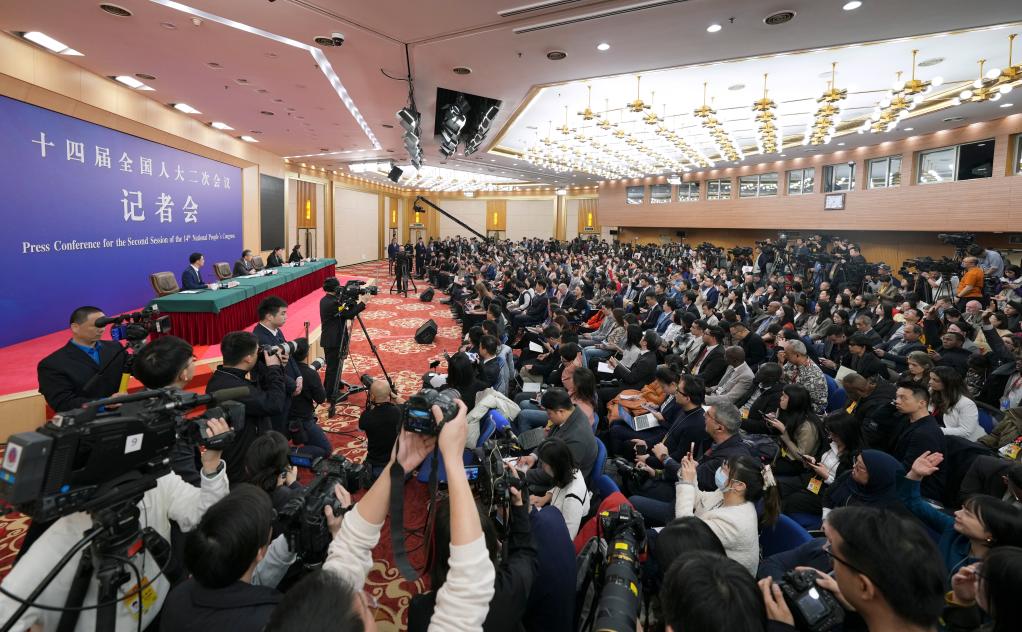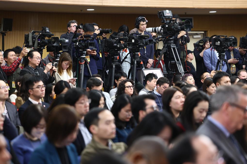 3月7日,十四届全国人大二次会议在北京梅地亚中心举行记者会。中共中央政治局委员、外交部长王毅就中国外交政策和对外关系回答中外记者提问。这是记者在现场采访。新华社记者 刘续 摄