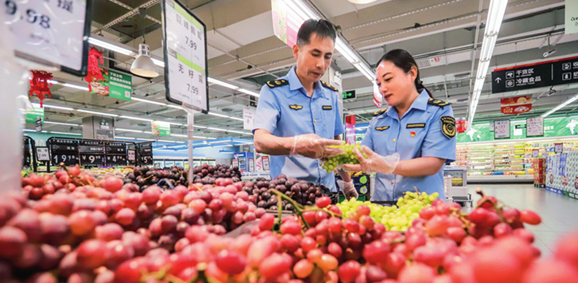 河北省遵化市市场监督管理局的工作人员在一家超市检查水果质量(2023年9月22日摄)刘满仓摄/本刊
