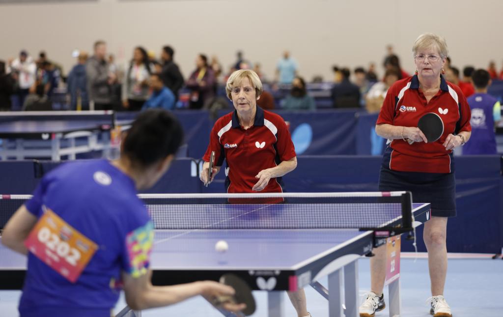 2023年12月16日,康妮·斯威里斯(中)参加2023年美国乒乓球公开赛老年组女子双打比赛。