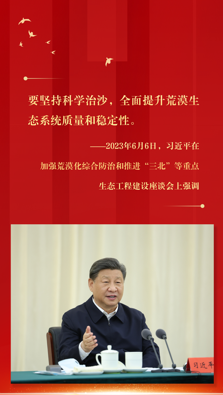 2023年6月5日至6日,习近平在内蒙古巴彦淖尔考察,并主持召开加强荒漠化综合防治和推进“三北”等重点生态工程建设座谈会。这是6日上午,习近平在临河区国营新华林场考察。