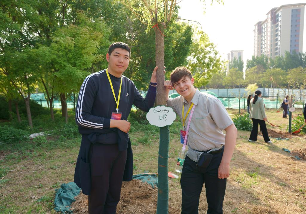 4月20日,在河北正定园博园,美国马斯卡廷中学学生约瑟夫·麦克尼利与中国学生陈星宇一起植树。