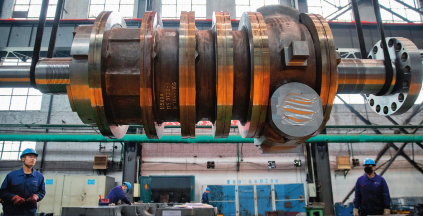 工作人员在哈电集团哈尔滨汽轮机厂有限责任公司车间内准备组装设备(2023年4月28日摄)。张涛摄/本刊