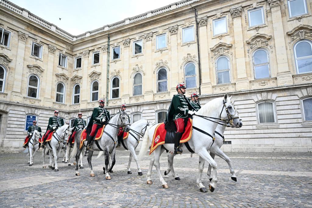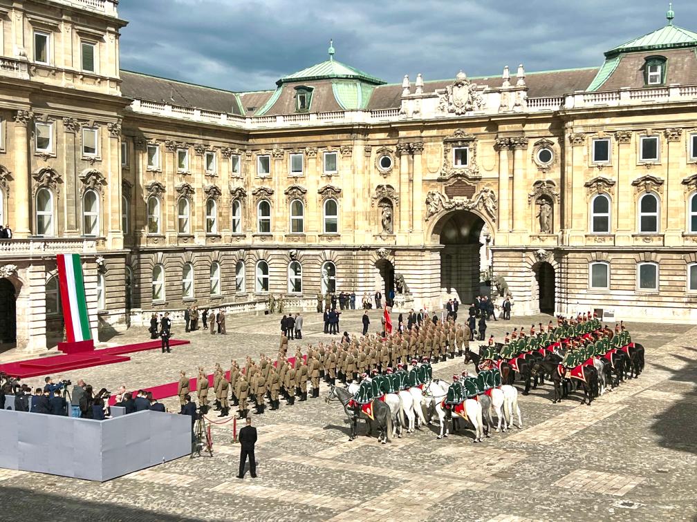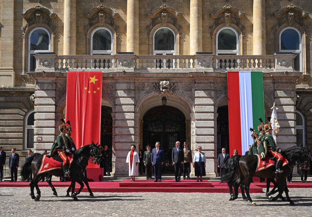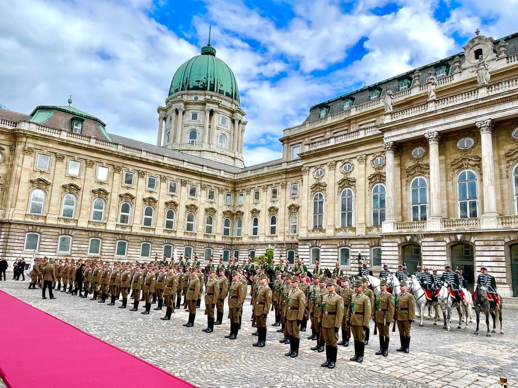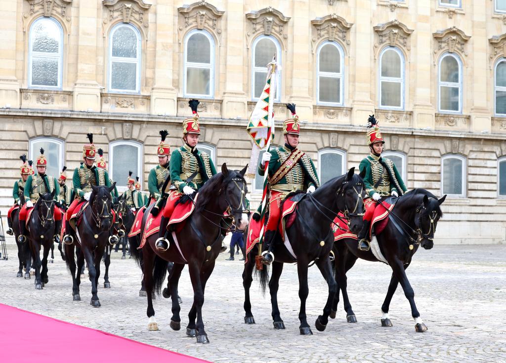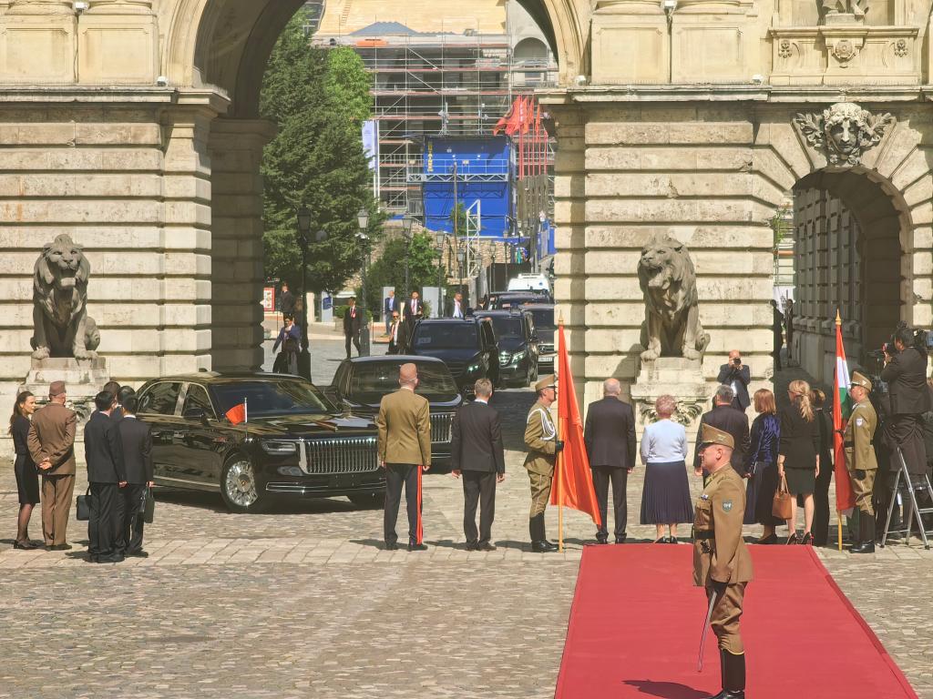 初夏时节的布达佩斯阳光明媚,古老宏伟的布达王宫庄严矗立,中匈两国国旗相映成辉。习近平和夫人彭丽媛乘坐的国宾车队在匈牙利礼宾马队护卫下缓缓驶入布达王宫内庭。舒尤克总统夫妇和欧尔班总理夫妇热情迎接。