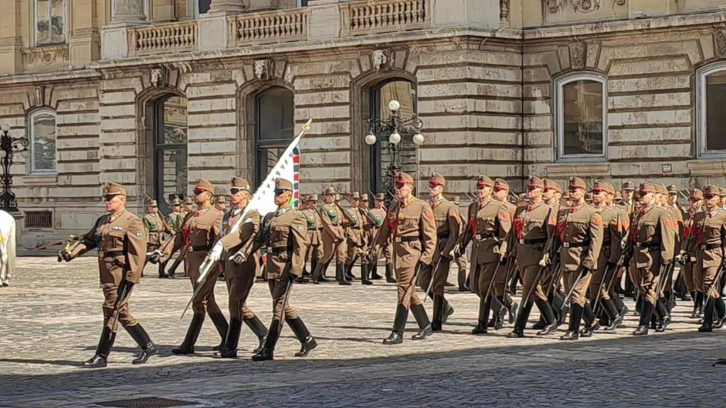 当地时间5月9日上午,国家主席习近平在布达佩斯出席匈牙利总统舒尤克和总理欧尔班共同举行的隆重欢迎仪式。习近平在舒尤克陪同下检阅国防军仪仗队和骑兵仪仗队。