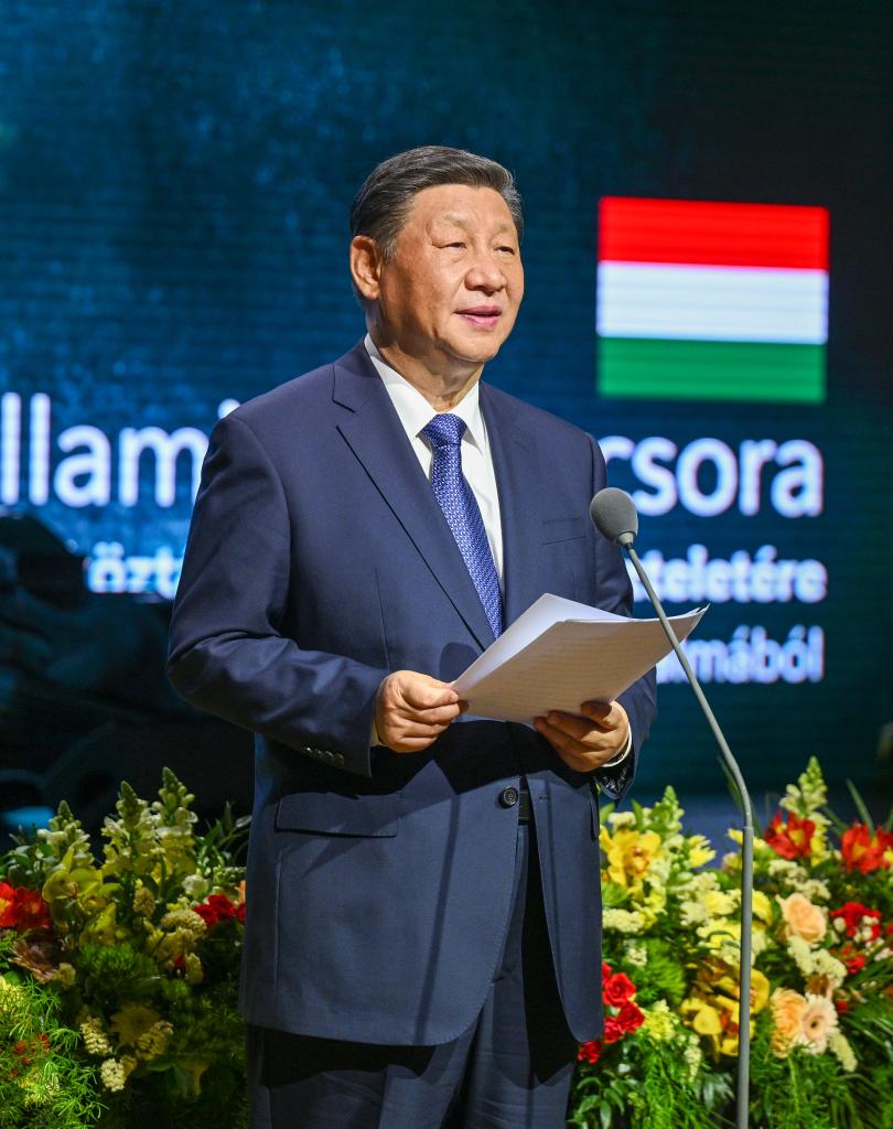 当地时间5月9日晚,国家主席习近平和夫人彭丽媛在布达佩斯城堡山出席匈牙利总理欧尔班和夫人雷沃伊举行的隆重欢迎宴会。这是习近平在宴会上致辞。