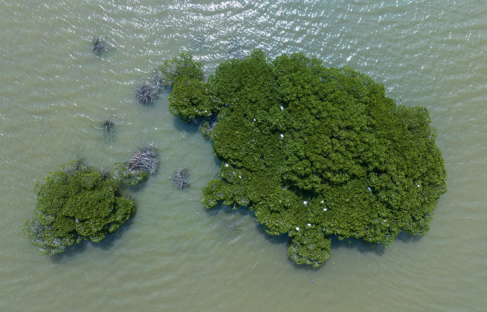 鹭鸟在广东湛江金牛岛的红树林上栖息(2024年5月17日摄,无人机照片)。广东湛江红树林国家级自然保护区,是中国面积最大、分布最集中的红树林自然保护区,是世界湿地生态恢复的成功范例。